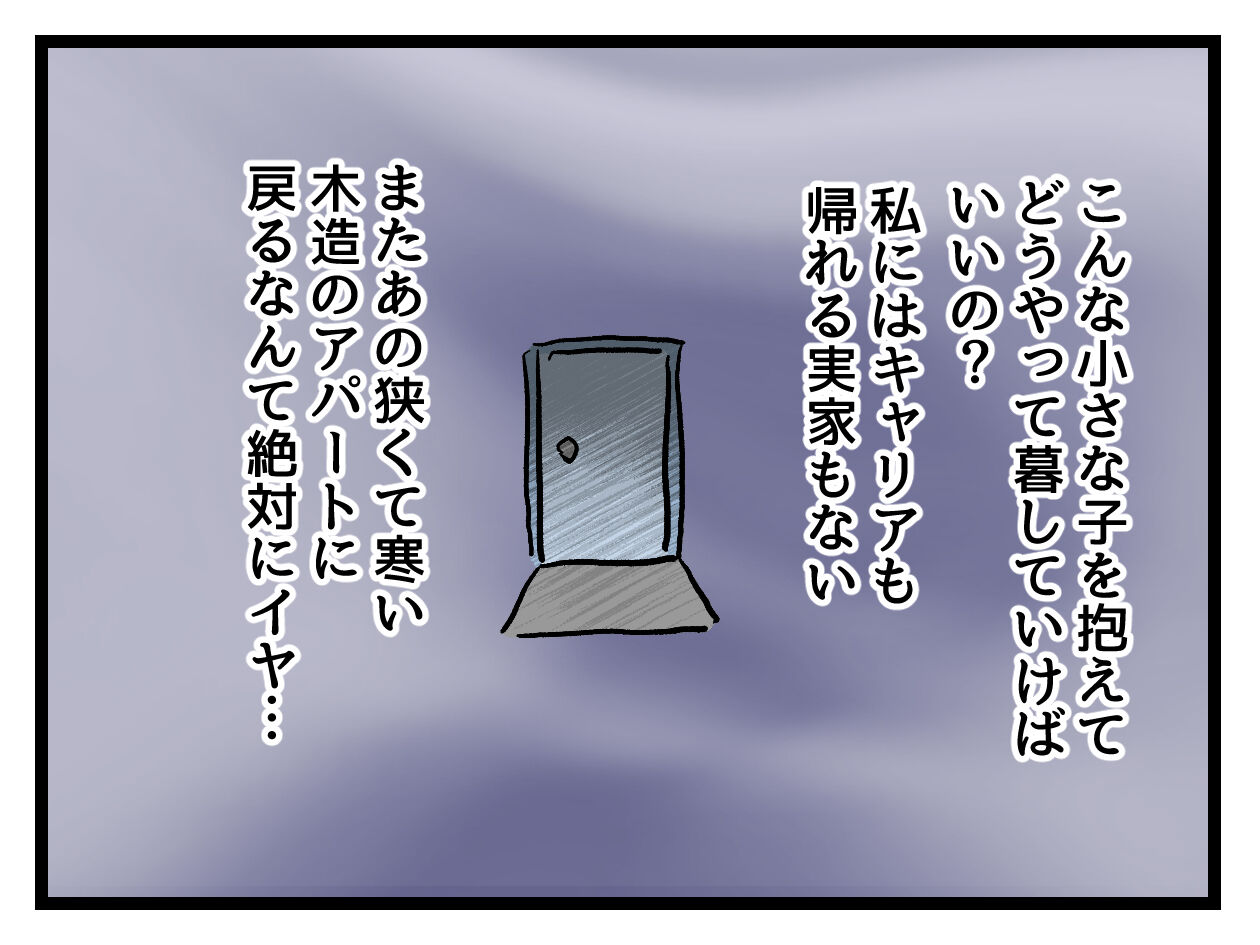私も、学もキャリアもない。ボロ屋に戻りたくないし、親も全く頼れず。2人の子を育てていく自信もないしで、なぁなぁと過ぎてしまいました。